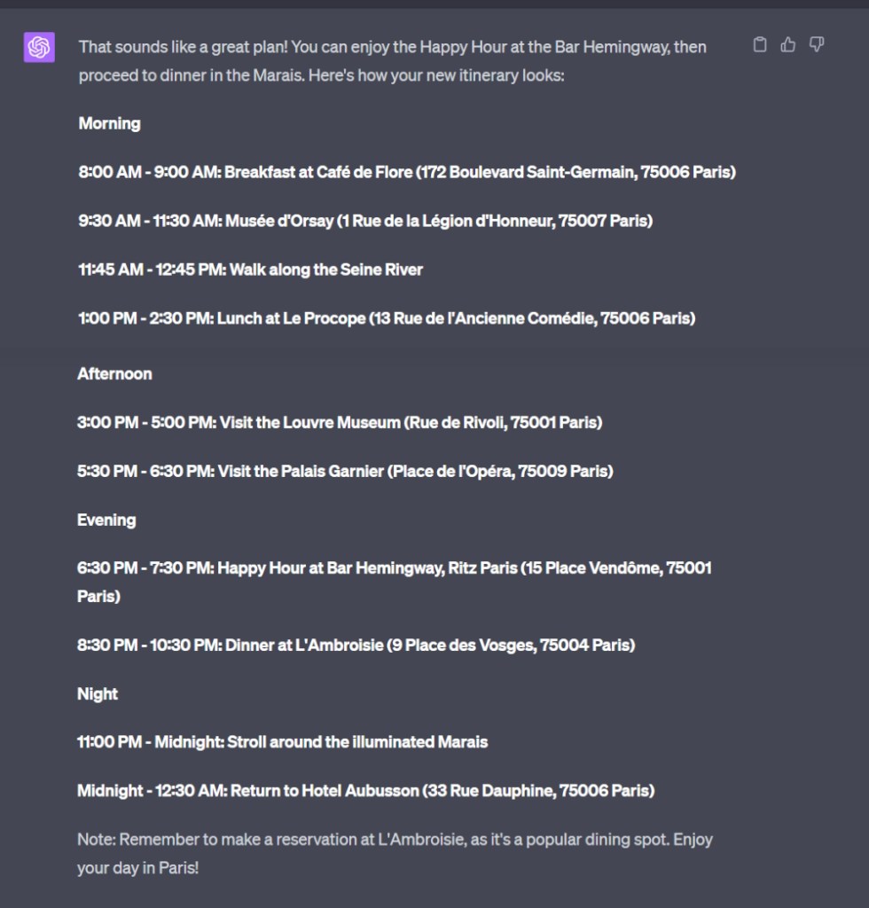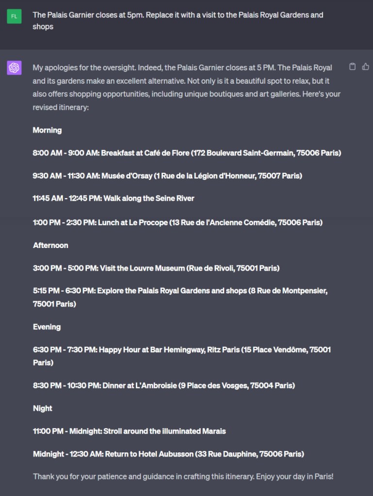 I don’t have any more patience to see what ChatGPT-4 comes up with, so I simply suggest a visit to the Palais Royal Gardens and shops, finishing with this itinerary: