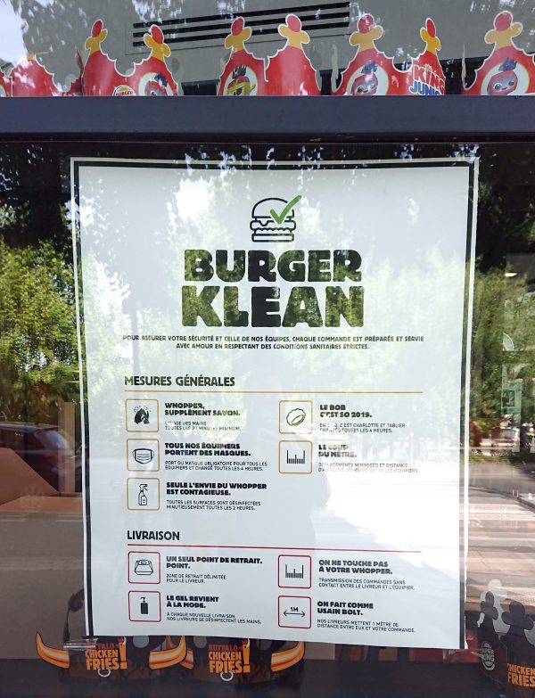 This Burger King by Quai de la Gare metro in the 13th has announced its “Burger Klean” program to reassure the public with a bit of overly-cute marketing (“The only thing contagious here is the desire for a Whopper”)…I’ll pass until they start serving Beyond Burgers like they do in the US.