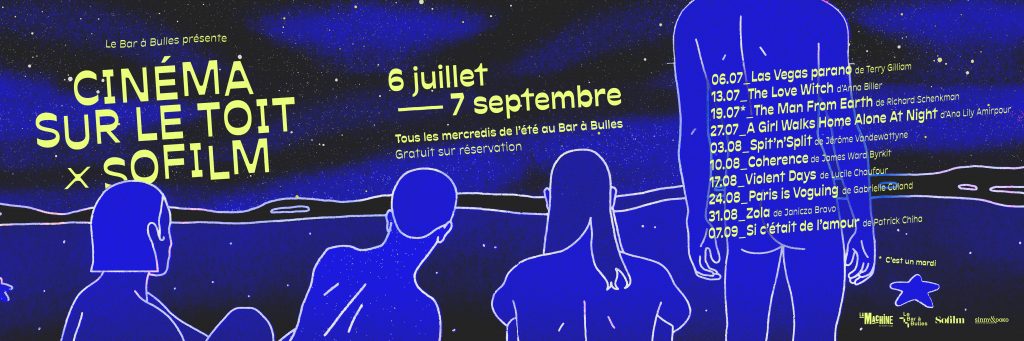 The Bar à Bulles is the rooftop bar of the nightclub attached to the famous cabaret, La Machine de la Moulin Rouge (90 blvd de Clichy, bar entrance at 4 Cité Veron, 18th, M° Blanche) with a view from the other side of the red windmill) hosts free film screenings every Wednesday night from June 29th through September 7th.