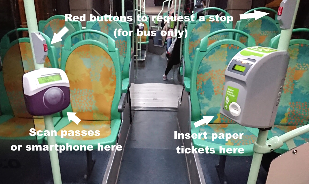 Inside the buses you’ll often find electronic signs indicating the next stop (accompanied by a voice recording) and the time until it reaches the end of the line. Push one of the red buttons if you want to get off. Always exit through the back doors (many open automatically, some require you to push a silver button).
